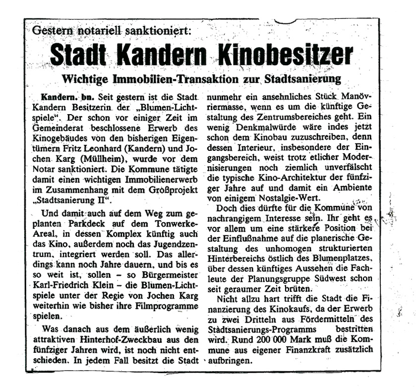 Anfang der 90er Jahre Erste Pläne seitens der Stadt Kandern, das Kino auf dem Blumenareal aufgrund städtebaulicher Maßnahmen abzureißen. Herr Karg verkauft das Kino an die Stadt. Proteste seitens Anwohner und Bürger der Stadt Kandern erzwingen den Erhalt. Es findet eine Wiedereröffnung des Kinos mit Herrn Karg als Pächter statt.